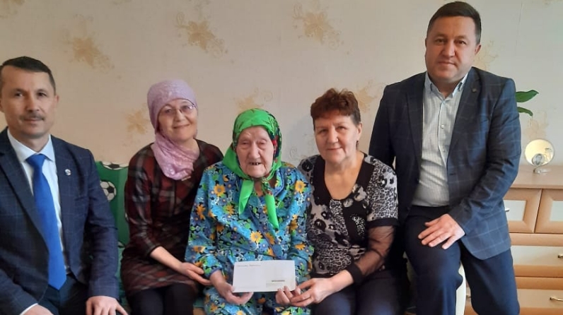 В этот памятный день поздравить долгожительницу приехали заместитель руководителя исполкома Сармановского муниципального района по инфраструктурному развитию Гайфутдинов Айрат Рифкатович и Глава МО "пгт Джалиль" Каримов Рафик Азгамович.
