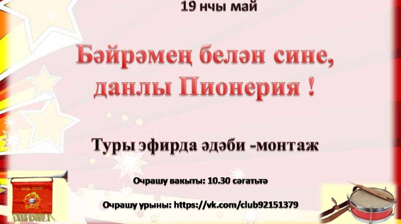 В честь этого праздника Сармановская центральная библиотека проведет литературный монтаж“Бәйрәмең белән сине, данлы Пионерия !” в прямом эфире в социальной сети” В Контакте .Начало в 10.30.