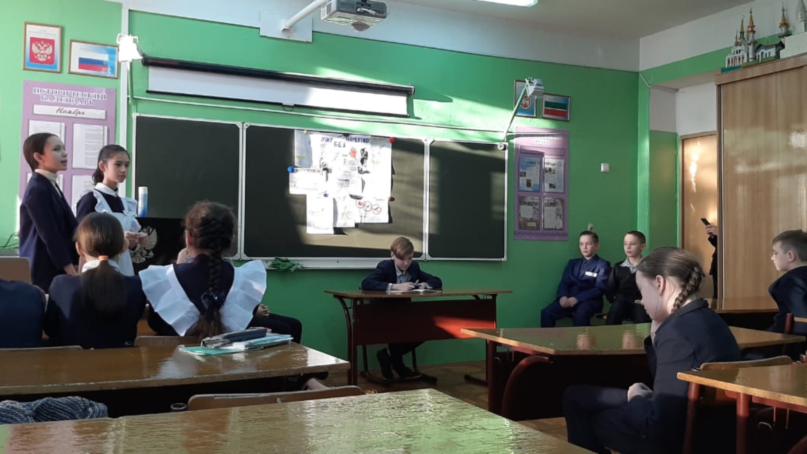 Сегодня, 18 ноября члены кружка" Правознайка" провели импровизированный суд- игру "Твое будущее без наркотиков" для учащихся 5а и 6б классов. Суд был состязательный, с участием прокурора и адвоката, где каждая сторона со стороны обвинения и защиты приглашали своих участников, таких как врача, химика, историка, искусствоведа и эксперта. Ученики внедрились в процесс игры и хоть это и было не всерьез, мы надеямся, что проблема нмркомании никогда не коснется нас и всех наших близких.