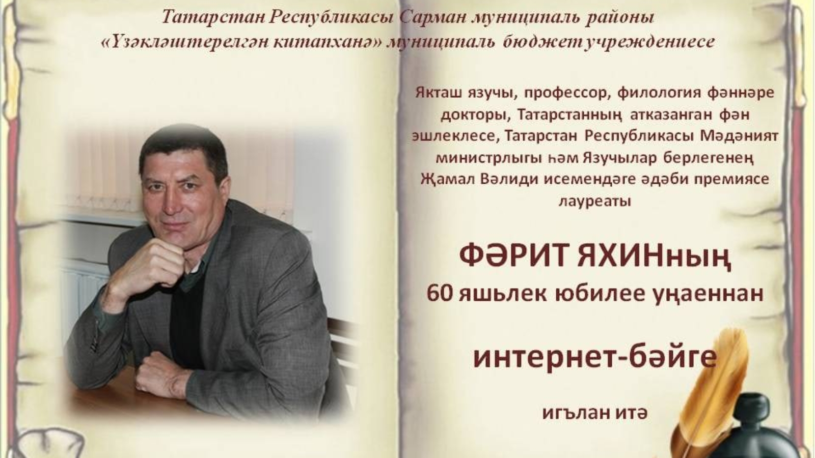Уважаемые друзья! Сармановская центральная библиотека приглашает вас принять участие в интернет-конкурсе, который пройдет с 17 ноября по 31 декабря 2020 года в честь 60-летнего юбилея земляка писателя, профессора, доктора филологических наук, заслуженного деятеля науки Татарстана, лауреата литературной премии Министерства культуры и Союза писателей Республики Татарстан имени Джамала Валиди Фарита Яхина.С условиями конкурса можно ознакомиться по ссылке https://vk.com/wall-92151379_7619