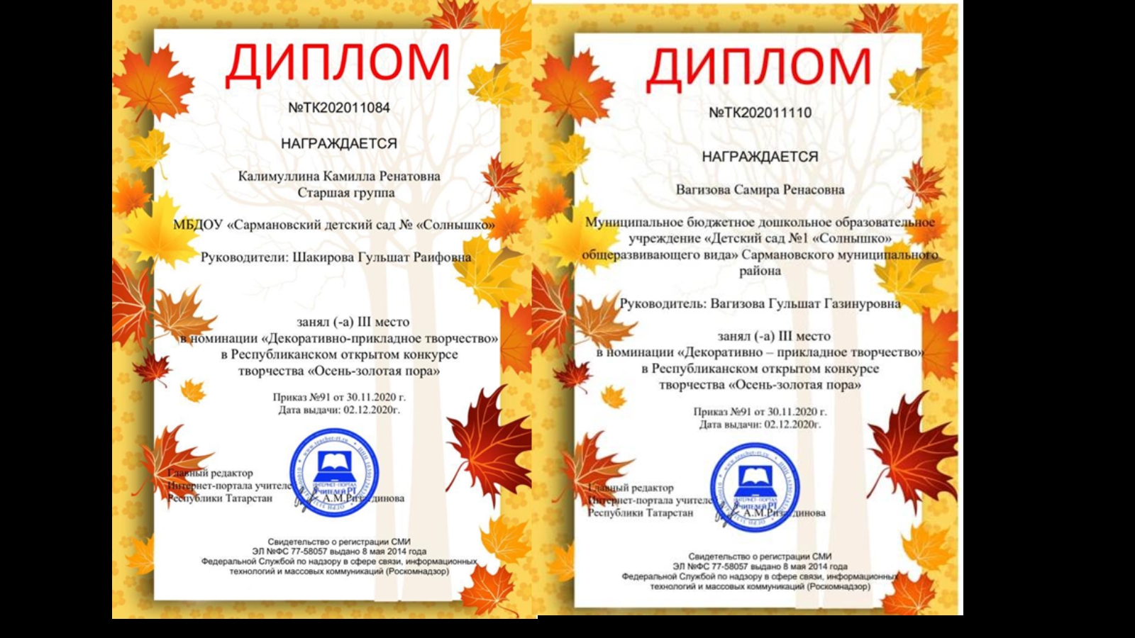 Воспитанники МБДОУ №1 "Солнышко" Калимуллина Камилла (руководитель Шакирова Г.Р.) и Вагизова Самира (руководитель Вагизова Г.Г. ) заняли 3 место в Республиканском открытом конкурсе творчества "Осень- золотая пора!" в номинации "Декоративно-прикладное творчество". Поздравляем!