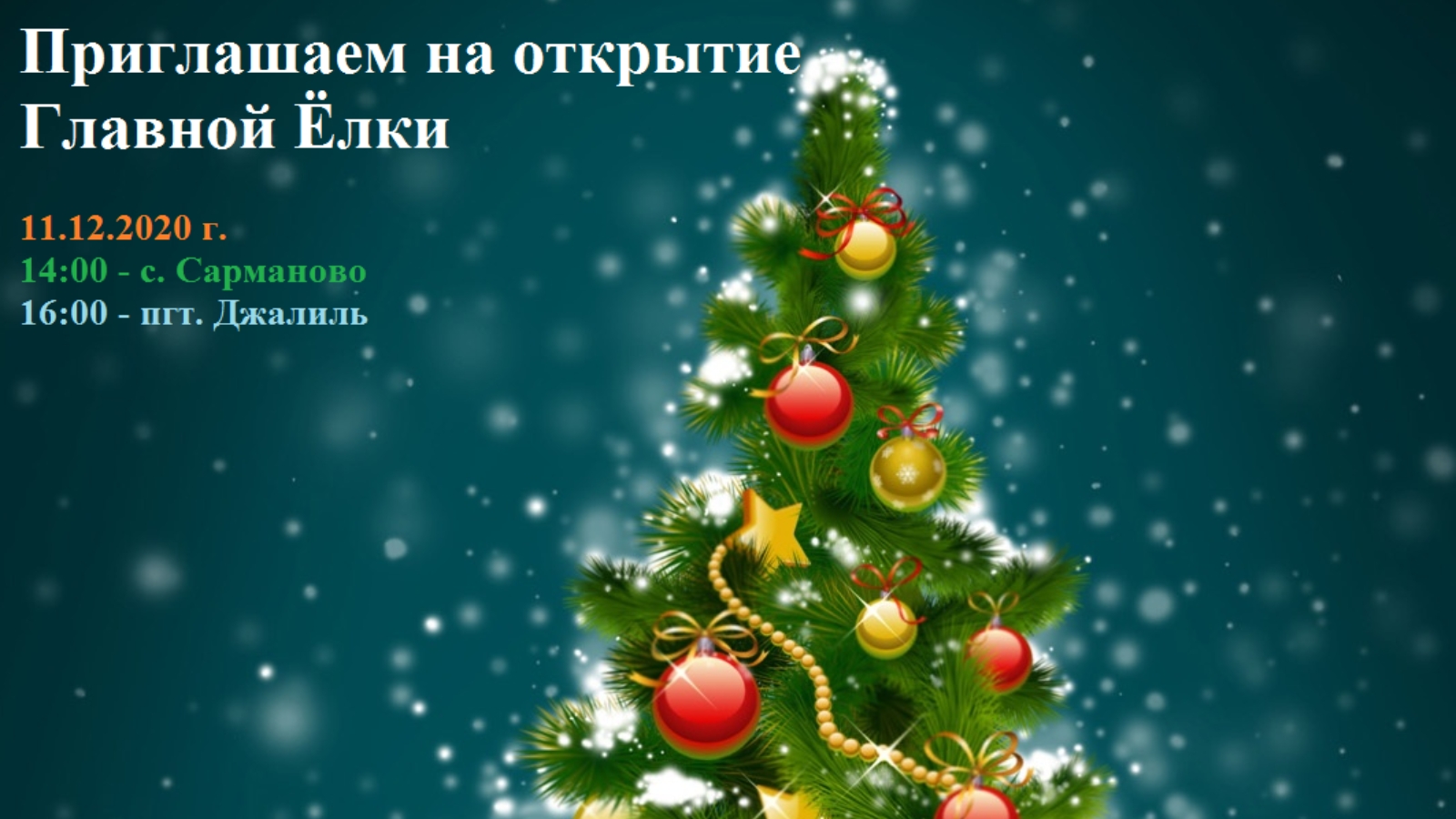 11 декабря в 14.00 в с.Сарманово и в 16.00 в пгт. Джалиль состоится торжественное открытие Главной елки. В программе будут развлекательные мероприятия, праздничное поздравление. Добро пожаловать на праздник!