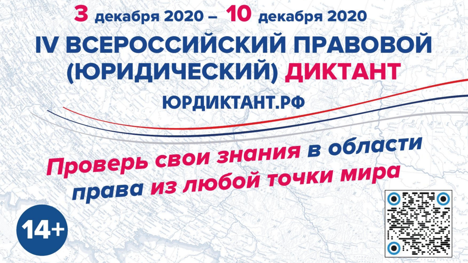 С 3 по 10 декабря прошел Четвертый Всероссийский правовой (юридический) диктант. Основные задачи Диктанта – повышение мотивации различных слоев населения к изучению права, получение объективной информации об уровне правовой грамотности населения России с учетом его возрастной и социальной структуры, привлечение российского общества к вопросу повышения уровня правовой культуры населения. В связи со сложившейся ситуацией, связанной с распространением коронавирусной инфекции, Диктант прошел в онлайн режиме на официальном портале юрдиктант.рф.