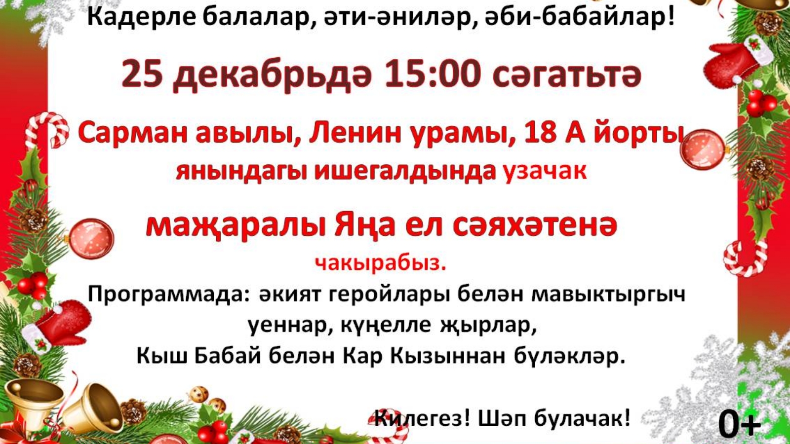 Мероприятие состоится 25 декабря во дворе дома № 18 А по улице Ленина в с.Сарманово. Начало: 15:00 часов.