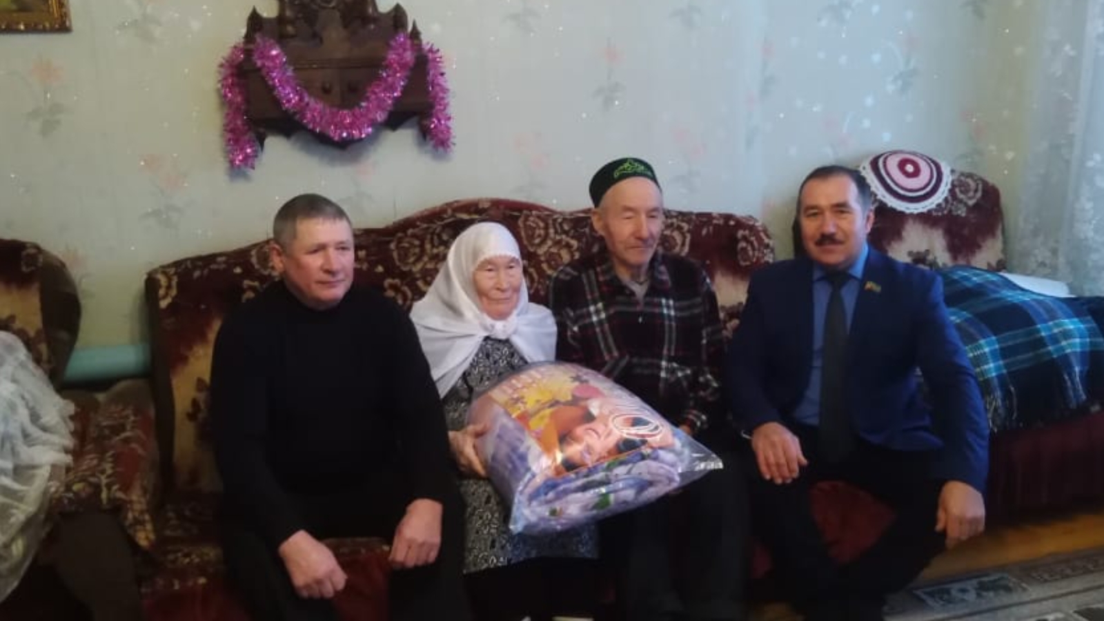 С этим знаменательным событием их поздравил глава сельского поселения Газизов Данияр Анварович, председатель совета ветеранов Рамазанов Хамит Закиевич, вручили памятные подарки с пожеланиями крепкого здоровья, любви и уважения родных и близких на долгие года.