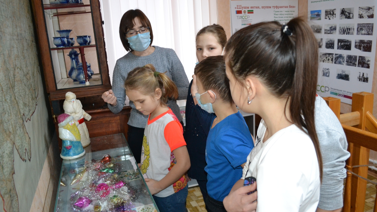 Во время зимних каникул в рамках акции «Нескучные каникулы» ежегодно проводятся экскурсии по экспозициям музея. Ребята с интересом ознакомились с выставкой новогодних игрушек и атрибутики праздника «Яңа ел бизәкләре. Новогодние игрушки». Основу коллекции новогодних игрушек составляют, подаренные нашим посетителем несколько игрушек и открыток, изготовленные в 1914 -1915 годах, коллекция с каждым годом пополняется.