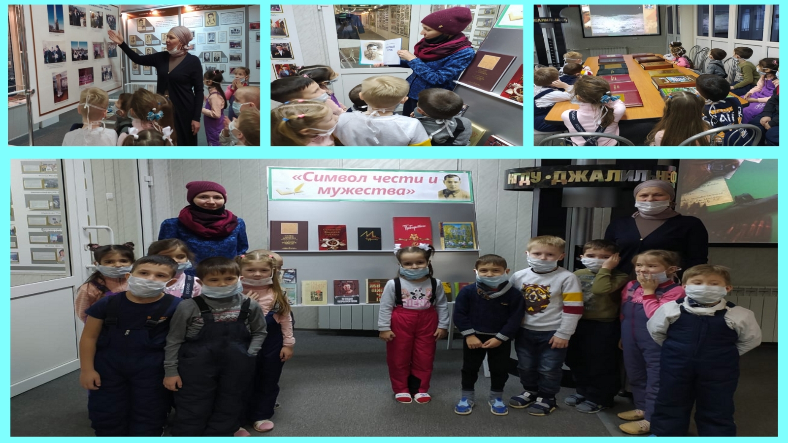 Дети подготовительной группы МБДОУ №3 «Алёнушка» посетили музей Трудовой славы. Цель посещения музея: формирование у воспитанников старшего дошкольного возраста гражданско-патриотических чувств; продолжать знакомить детей с жизнью и творчеством поэта-героя Мусы Джалиля. Во время посещения музея заведующая Джалильской библиотеки Файрушина А.И. презентовала новую книгу Мусы Джалиля “Первый урок”.