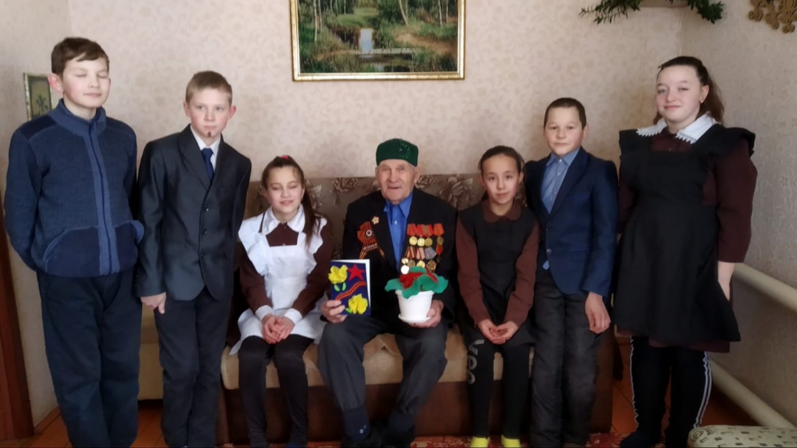 Ученики 6 класса посетили ветерана Великой Отечественной войны Халилова Мизхат абый. Мизхат абый-единственный в селе ветеран Великой Отечественно войны. Мизхат абый – 1925 год рождения. Ушел на войну в 1943 года, ему не было еще и 18 лет. Их отправили на границу Японии. Мизхат абый вернулся с войны 1947 года, отслужив свой долг перед Родиной. Сейчас ему 95 лет.