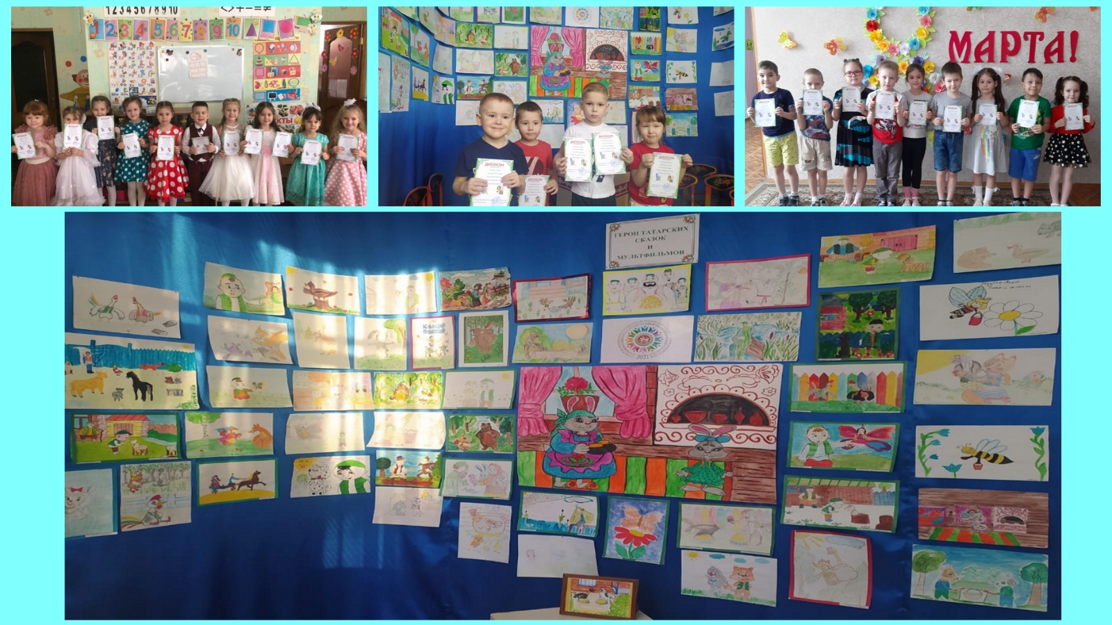 В МБДОУ №3 «Алёнушка» прошел смотр-конкурс совместных работ детей и родителей: «Герои татарских сказок и мультфильмов». Задачи смотра-конкурса: продолжать знакомить детей с татарскими народными сказками и мультфильмами; приобщать детей к художественному творчеству; передавать в рисунках эпизоды понравившихся сказок и мультфильмов. Победители награждены дипломами.