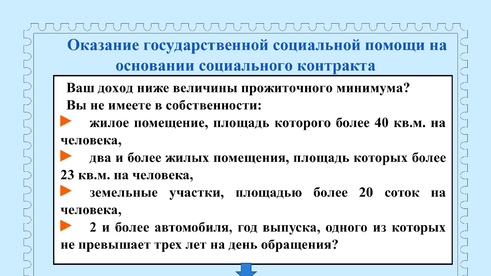 Постановлением Кабинета Министров Республики Татарстан от 02.09.2014 №635 «Об оказании государственной социальной помощи, в том числе на основании социального контракта, в Республике Татарстан» предусмотрено оказание государственной социальной помощи на основании социального контракта малоимущим семьям и малоимущим одиноко проживающим гражданам, которые по не зависящим от них причинам имеют среднедушевой доход ниже величины прожиточного минимума, установленного в Республике Татарстан для соответствующих социально-демографических групп населения, на реализацию следующих мероприятий: