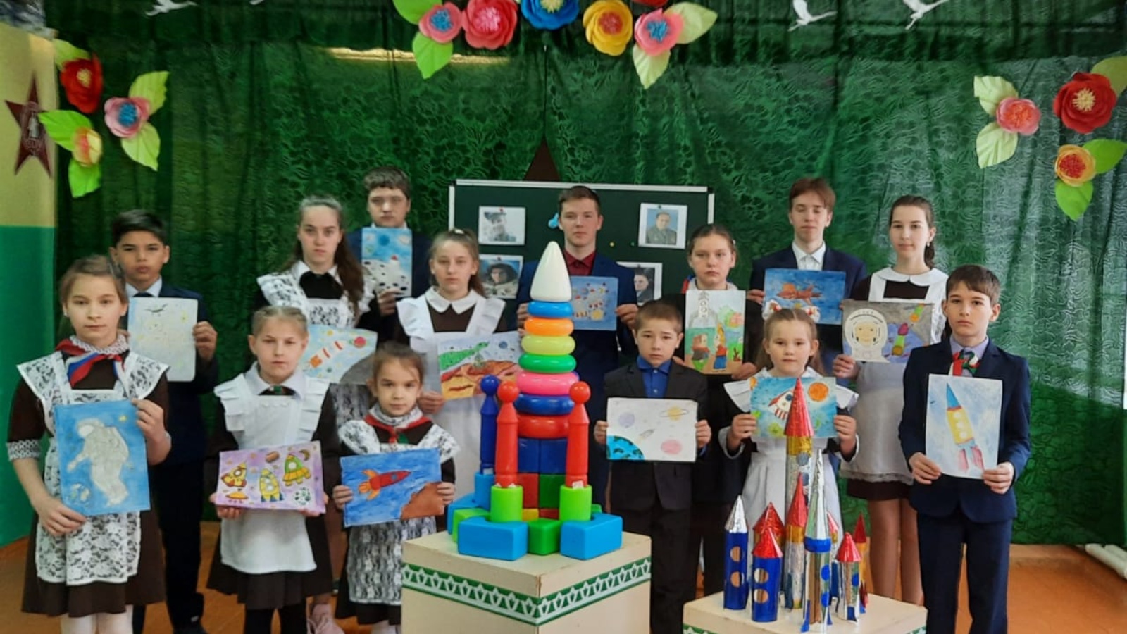выставка рисунков «Путь в космос», флешмоб «Наука – это космос», викторина «Первые в космосе» , в ходе которых ребята читали стихи о первом космонавте, отвечали на вопросы, конструировали ракеты, исполняли танцы. Все организованные мероприятия прошли было увлекательно и познавательно.