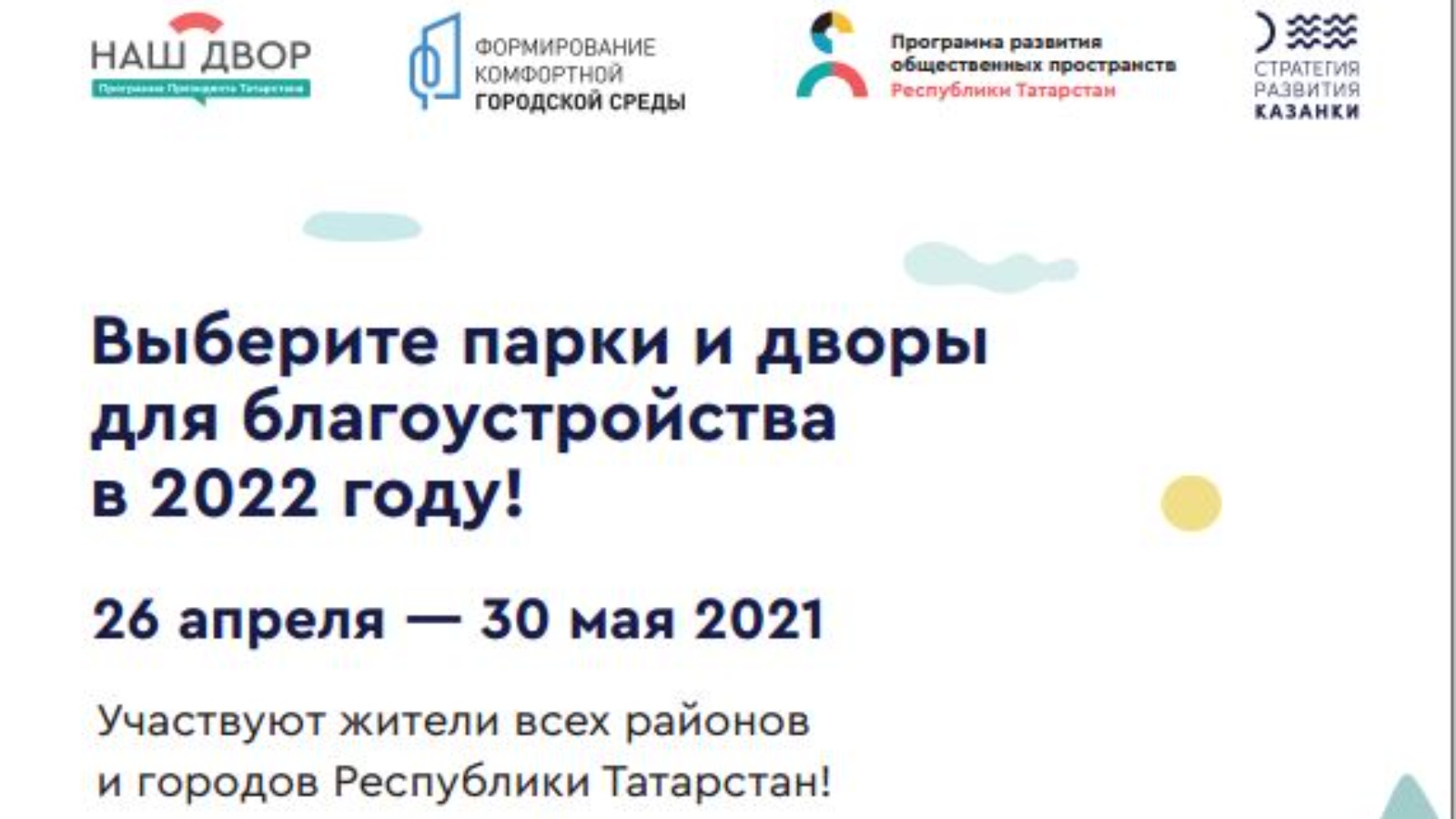 Проводится голосование по отбору общественных пространств, планируемых к благоустройству в 2022 году на единой федеральной платформе, которое состоится с 26 апреля по 30 мая 2021 года. Для Республики Татарстан Минстроем России согласовано проведение рейтингового голосования по выбору общественных пространств, планируемых к благоустройству в 2022 году на Портале государственных и муниципальных услуг Республики Татарстан через сервис «Опросы жителей» и в мобильном приложении «Услуги РТ».