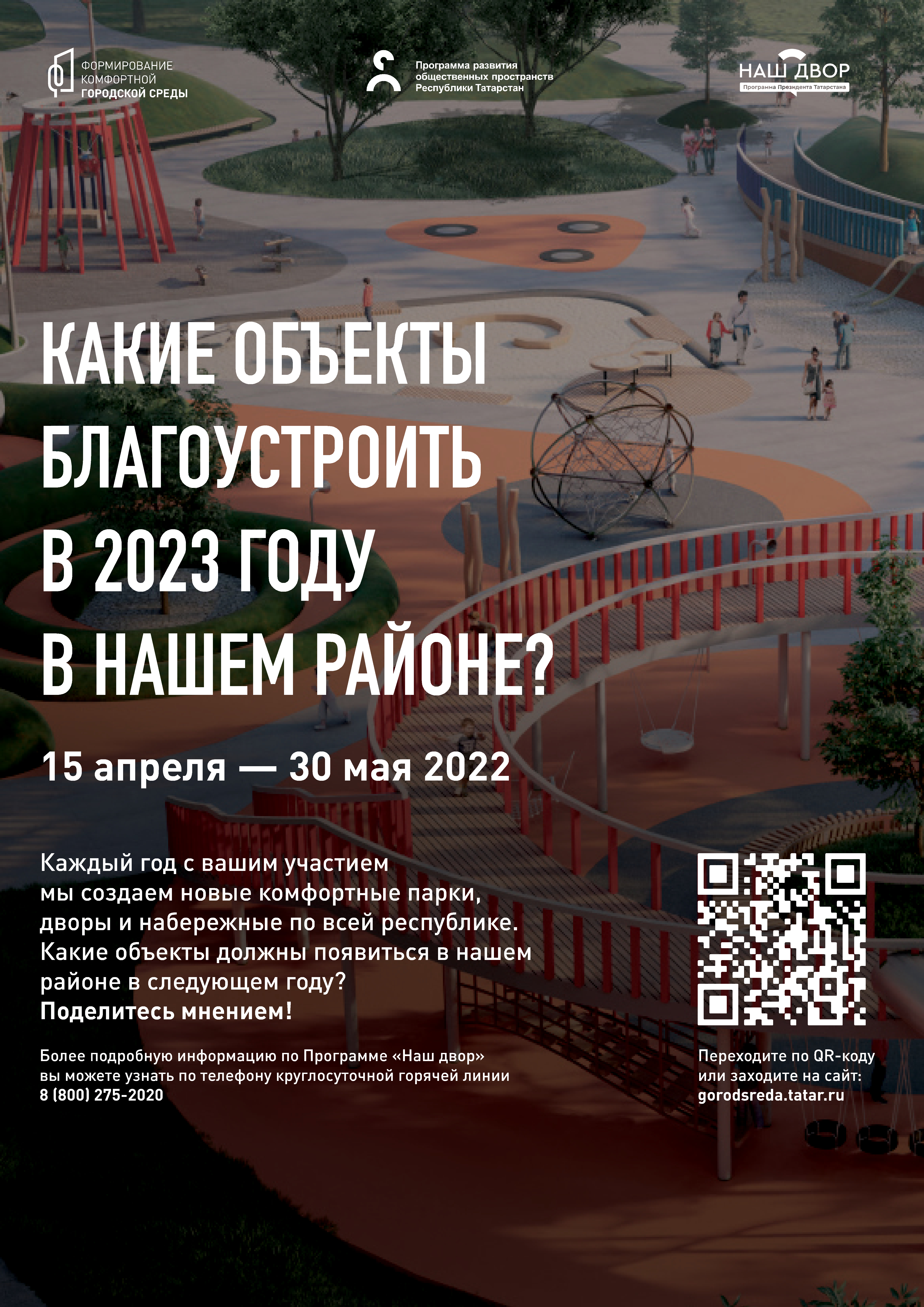 В целях вовлечения граждан к реализации федерального проекта «Формирование комфортной городской среды» Минстроем России совместно с АНО «Диалог Регионы» принято решение о проведении голосования по отбору общественных пространств, планируемых к благоустройству в 2023 году на единой федеральной платформе, которое состоится с 15 апреля по 30 мая 2022 года. Для Республики Татарстан Минстроем России согласовано проведение рейтингового голосования по выбору общественных пространств, планируемых к благоустройству в 2023 году на Портале государственных и муниципальных услуг Республики Татарстан через сервис «Опросы жителей» и в мобильном приложении «Услуги РТ».