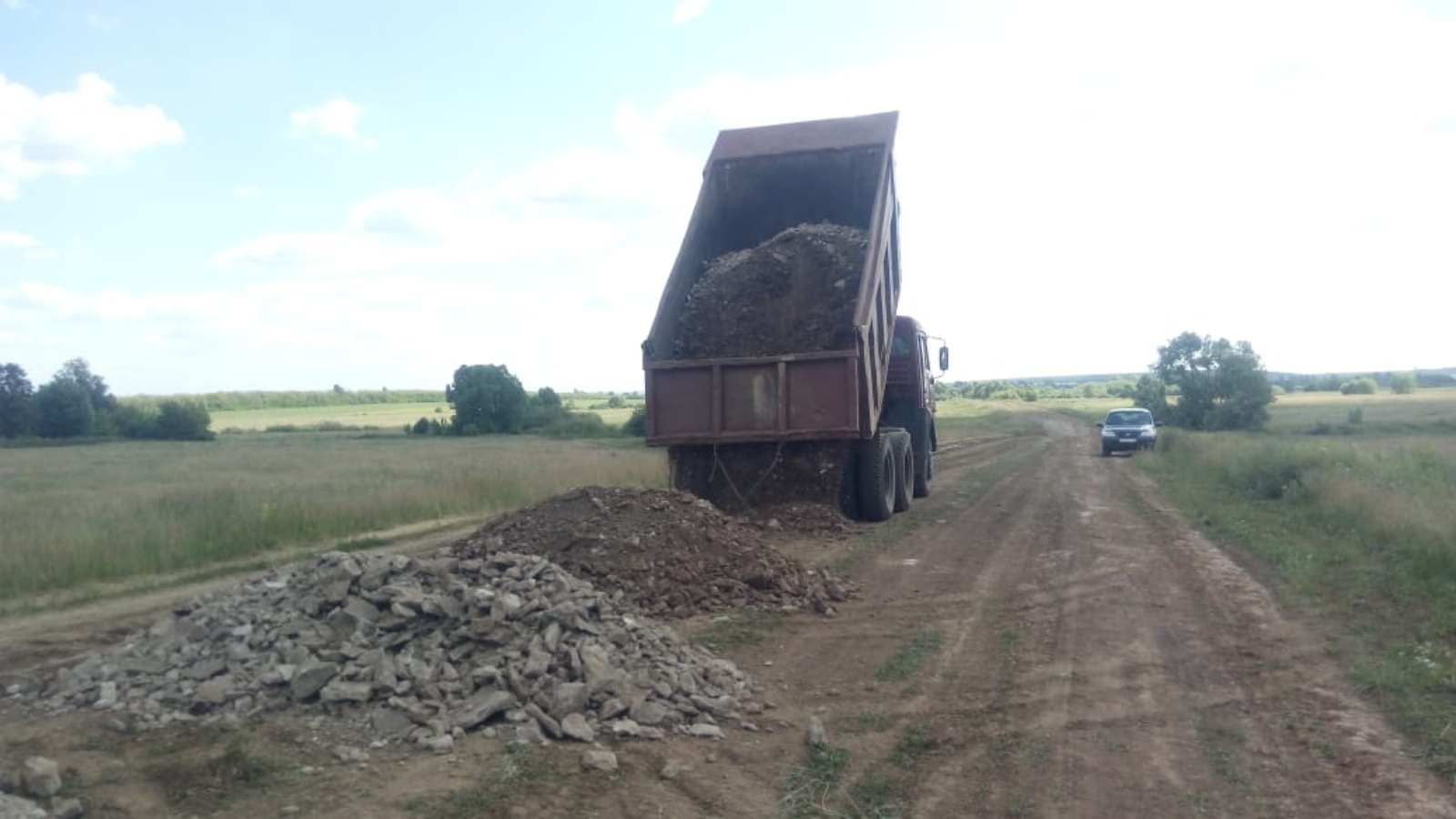 Идет ремонт щебеночных покрытий (перевозка щебня) в н.п. Нижний Бикмет между дорогами Нижний Бикмет - Альметьево