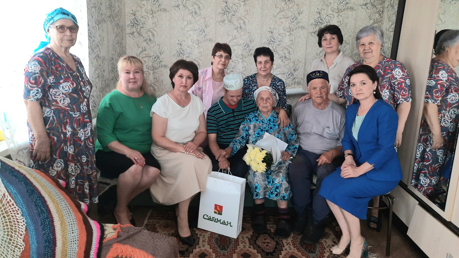 В этот прекрасный день юбиляра поздравили: заместитель Главы Сармановского МР РТ Г.Р. Гараева, директор ГАУСО КЦСОН «Шафкать» МТЗ и СЗ РТ в Сармановском муниципальном районе Г.И. Хузина, заместитель руководителя исполкома пгт Джалиль Г.М. Идиатуллина. Имениннице вручили письмо из Кремля от Президента РФ Владимира Путина и памятные подарки.