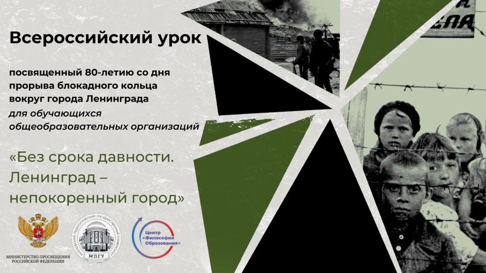 В рамках Всероссийской акции, посвящённой Дню полного освобождения Ленинграда от фашистской блокады, 27 января прошел Всероссийский урок, посвященный 80-летию со дня прорыва блокадного кольца вокруг города Ленинграда для обучающихся общеобразовательных организаций и организаций среднего профессионального образования «Без срока давности. Ленинград – непокоренный город». Прошел показ видеофильма «Блокада Ленинграда, трудные условия жизни и подвиг ленинградцев» и «Признание геноцида: Блокада Ленинграда».