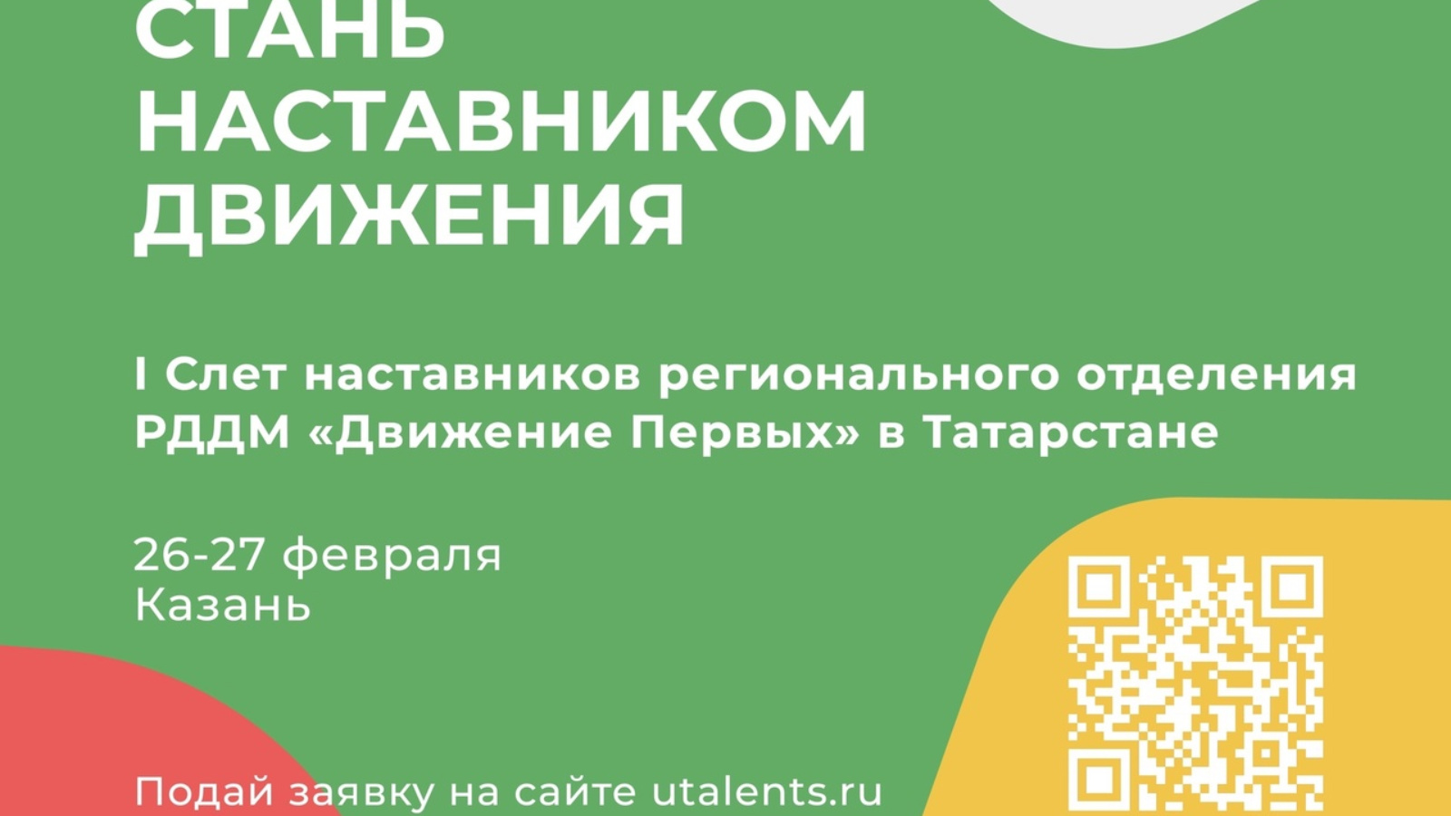 С 27 февраля по 1 марта 2023 года в г.Казани совместно с Региональной общественной организацией «Академия творческой молодёжи Республики Татарстан» будет организован I Слет наставников регионального отделения Общероссийского общественно-государственного движения детей и молодежи «Движение первых» Республики Татарстан