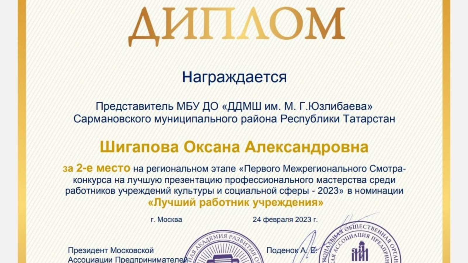 В начале февраля 2023 года преподаватель "ДДМШ им. Юзлибаева" Шигапова Оксана Александровна принимала участие в «Первом Межрегиональном Смотра-конкурсе