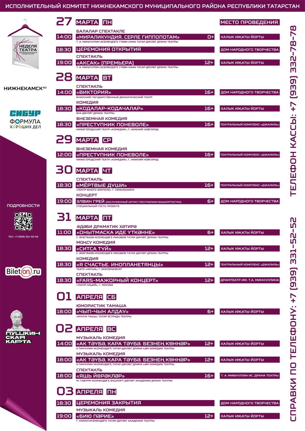 С 27 марта по 3 апреля 2023 года на трёх площадках города Нижнекамск: Дом народного творчества, театральный комплекс «Джалиль» и Государственный Татарский Драматический театр им. Т.А. Миннуллина пройдёт «Неделя театров нефтегазохимических городов России».