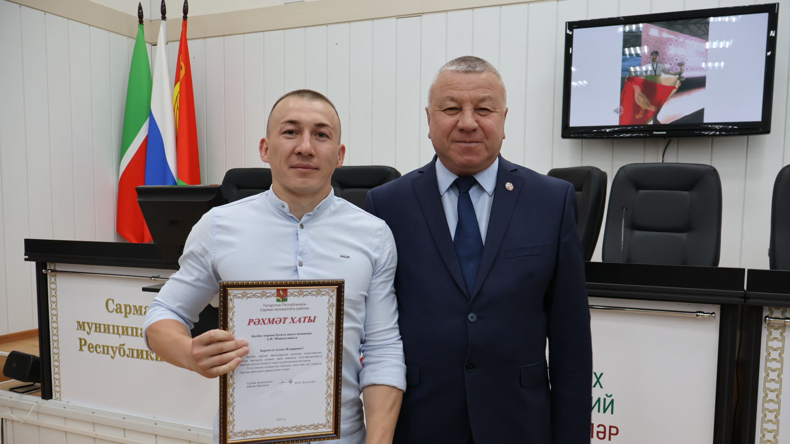 Глава района Фарит Хуснуллин лично поздравил нашего батыра, чемпиона мира по борьбе на поясах Корэш Алмаза Миннехузина. Вручил Благодарственное письмо и памятный подарок.