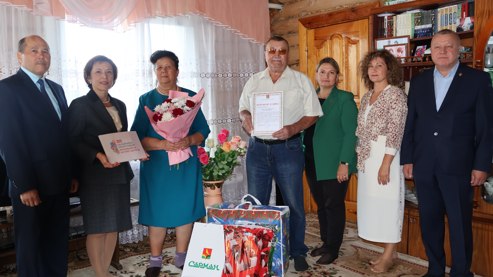 Сегодня в с. Сарманово состоялось чествование юбиляров семейной жизни. В рамках проекта «Крепкая семья», Всероссийского социального про-семейного проекта «Семья - основа мира» и Года национальных культур и традиций Глава Сармановского района Фарит Мунавирович Хуснуллин поздравил юбиляров Альберта и Разию Каримовых с Золотой свадьбой. Свои добрые пожелания и поздравления юбилярам выразили заместитель руководителя Исполнительного комитета, председатель Совета женщин района Индира Сахипова, начальник отдела ЗАГС Гульчачак Валишина, руководитель Исполнительного комитета Сармановского сельского поселения Лилия Шарипова, председатель Совета ветеранов Асыляр Харисов, родные и близкие. Юбилярам было вручено Благодарственное письмо Главы муниципального района и памятные подарки с пожеланиями крепкого здоровья, любви и уважения родных и близких на долгие годы.