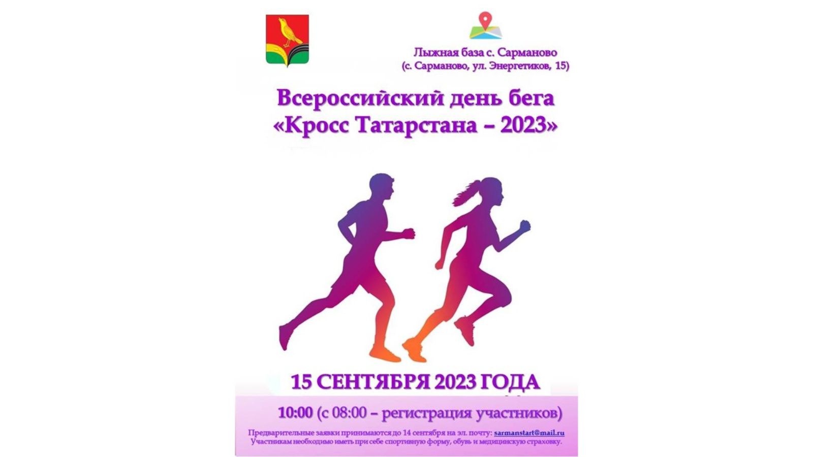 15 сентября в с. Сарманово пройдет "Кросс Татарстана-2023" в рамках Всероссийского дня бега "Кросс Нации-2023". По традиции соревнования планируется провести на Лыжной базе с.Сарманово (с. Сарманово, ул.Энергетиков, 15).