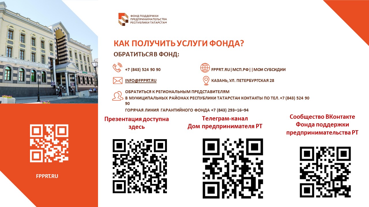 Подробную информацию можно получить в Центре микрофинансирования Фонда по адресу: город Казань, улица Петербургская, дом 28, или по телефону «горячей линии» +7 (843) 524-90-90.