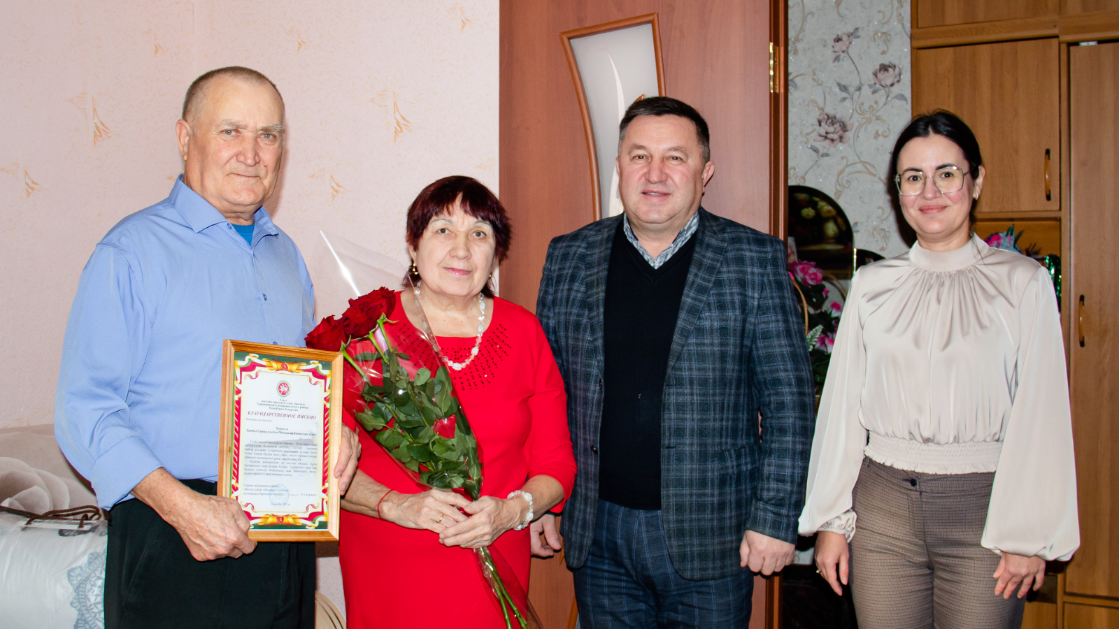 С этим знаменательным событием их поздравили Глава МО «п.г.т. Джалиль» Сармановского МР РТ Каримов Р.А. и ведущий специалист отдела ЗАГС исполнительного комитета п.г.т. Джалиль Сармановского МР РТ Гарифуллина И.А. Каримов Р.А. юбилярам вручил благодарственное письмо и памятный подарок. Он в своём поздравлении отметил, что такие семьи являются образцом супружеского счастья, верности и примером для молодого поколения.
