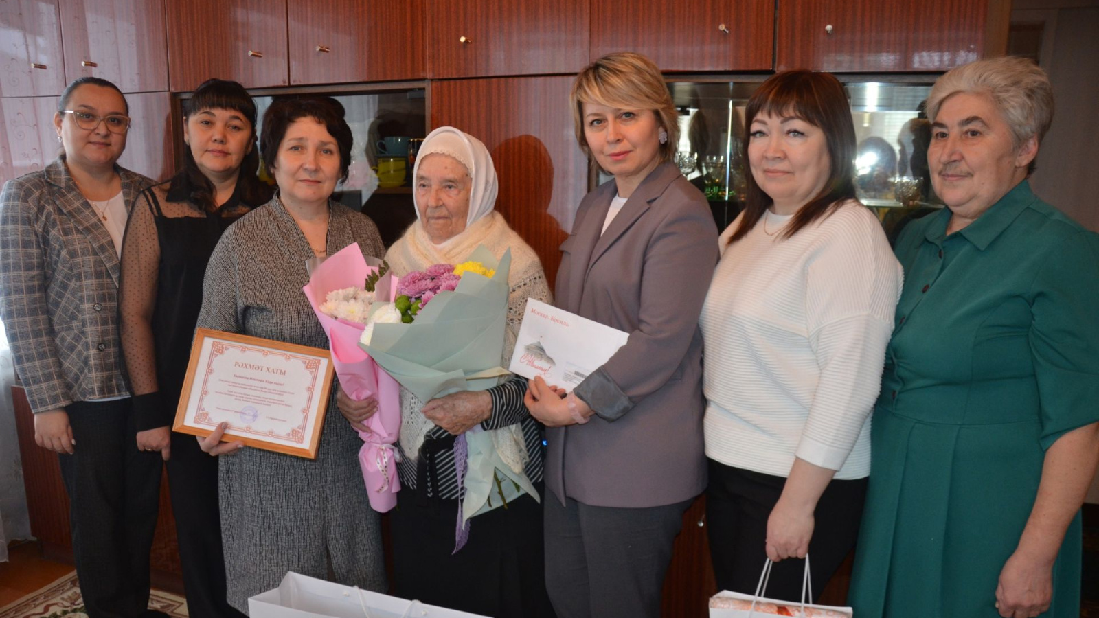Тыл ветеранын район Советы аппараты җитәкчесе Юлия Исмәгыйлова котлады, изге теләкләрен җиткереп, Рәсәй Президенты Владимир Путинның Котлау хатын, район башлыгы Фәрит Хөснуллин исеменнән чәчәк бәйләме, истәлек бүләкләре тапшырды.