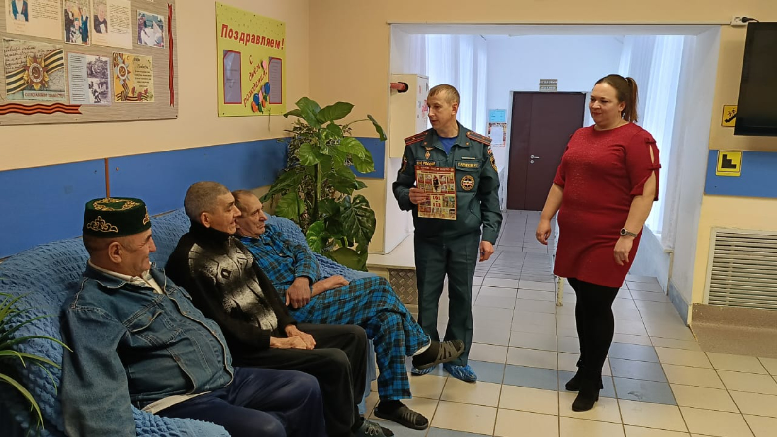 Сегодня старший инспектор межрайонного отдела надзорной деятельности и профилактической работы по Муслюмовскому и Сармановскому муниципальным районам Гарипов Рустем Габдулхаевиче осуществил профилактический визит в Джалильский дом-интернат для престарелых и инвалидов. В рамках мероприятия в учреждении проверена исправность систем автоматической пожарной сигнализации, оповещения людей о пожаре, системы дистанционного мониторинга, содержание путей эвакуации, эвакуационных и первичных средств пожаротушения. В ходе данного мероприятия с работниками проведена тренировка по эвакуации людей на случай возникновения пожара. В рамках профилактической работы, были проведены учебно-познавательные занятия с жителями дома-интерната. С работниками учреждения были проведены дополнительные инструктажи по пожарной безопасности.