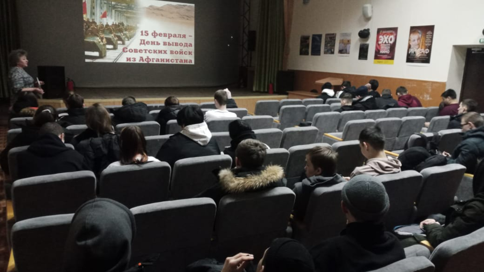 15 февраля — День памяти о россиянах, исполнявших служебный долг за пределами Отечества. Это официальная памятная дата в Российской Федерации, призванная почтить память воинов-интернационалистов, исполнявших интернациональный долг за пределами границ своей Родины. Именно в этот день, 15 февраля 1989 года, последняя колонна советских войск покинула территорию Афганистана. 15 февраля 2024 года исполнилось 35 лет со дня вывода советских войск из Демократической Республики Афганистан. В связи с этим 15 февраля в кинотеатре «Сарман» состоялся показ видеороликов перед сеансами. Для студентов Аграрного колледжа состоялся показ фильма «Квест».