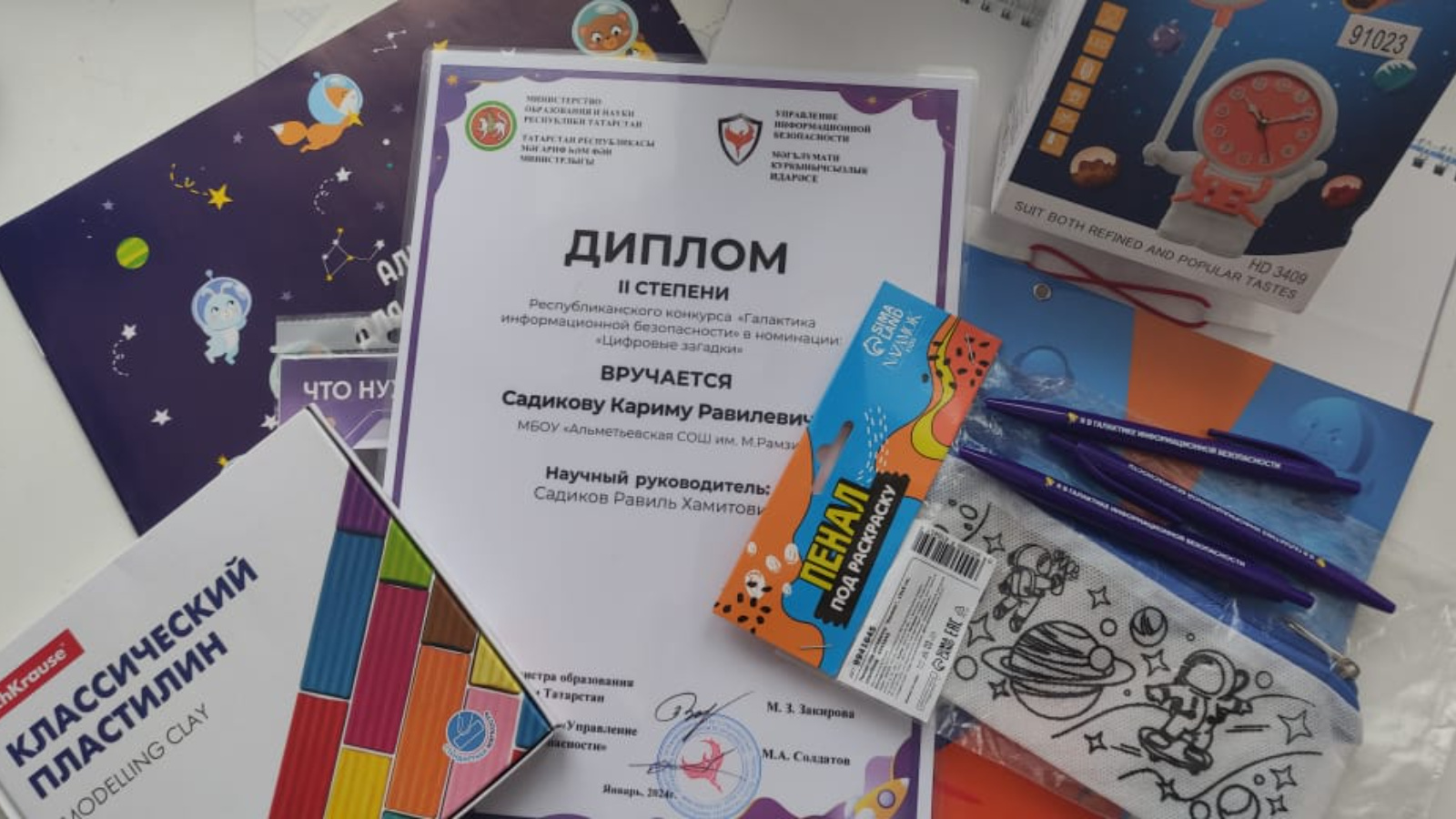 Ученик 2 класса МБОУ "Альметьевская СОШ имени Мурада Рамзи" Садиков К.Р. занял второе место в Республиканском конкурсе «Галактика информационной безопасности» в номинации "Цифровые загадки". Данный конкурс проводился по направлению повышению компетенции учеников в области информационной безопасности и развитию творческой активности для профилактики правонарушений в Интернете. Хотим сказать огромное спасибо организаторам проекта за интересные темы конкурсов, за замечательные памятные подарки!