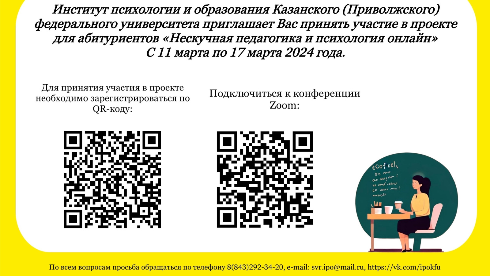 Институт психологии и образования Казанского (Приволжского) федерального университета приглашает Вас принять участие в проекте «Нескучная педагогика и психология онлайн» с 11 по 17 марта 2024 года (https://vk.com/wall-64292539_4160).