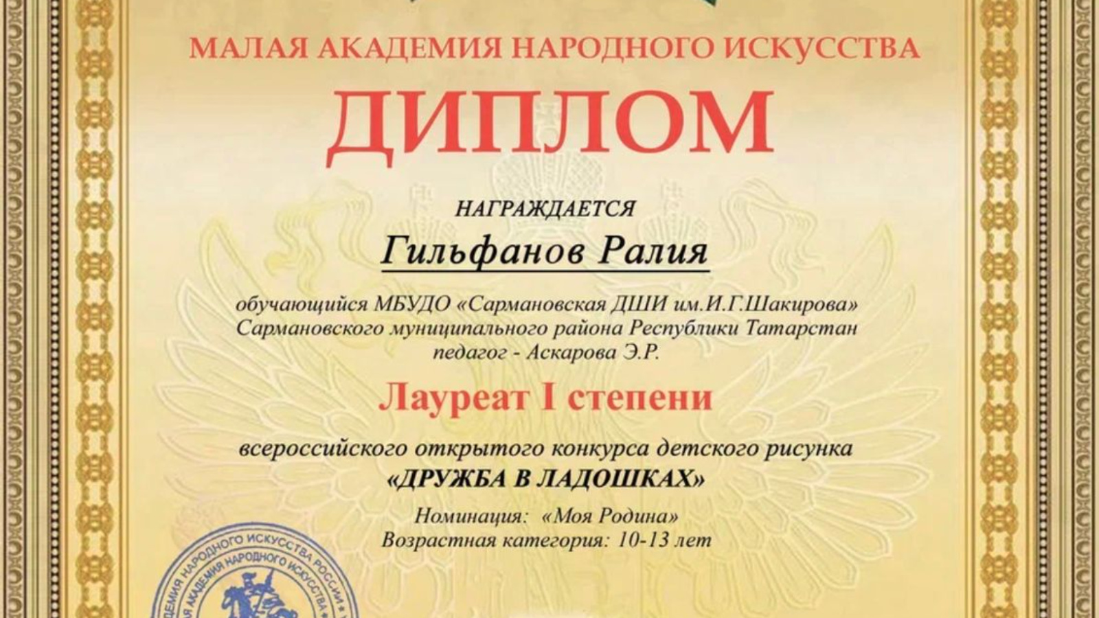 Подведены итоги Всероссийского открытого конкурса детского рисунка “Дружба в ладошках». Поздравляем учащихся художественного отделения МБУДО «Сармановская ДШИ им.И.Г.Шакирова» с великолепными результатами!