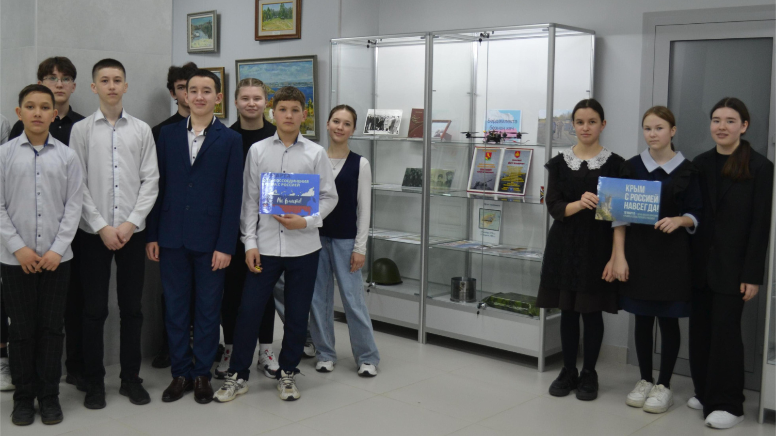 Для учащихся 8 А класса МБОУ "Сармановская гимназия" проведена беседа-лекция "Крым в истории России", а так же они ознакомились с выставкой посвященной нашим землякам-участникам специальной военной операции.