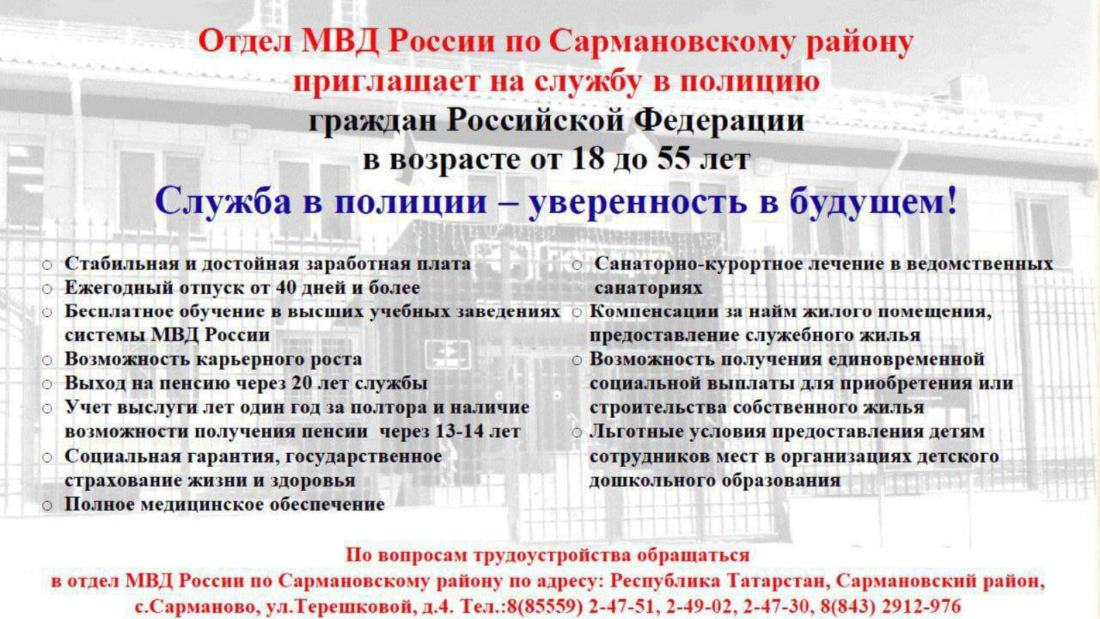 По вопросам трудоустройства обращаться в отдел МВД России по Сармановскому району по адресу: Республика Татарстан, Сармановский район, с.Сарманово, ул.Терешковой, д.4. Тел.:8(85559) 2-47-51, 2-49-02, 2-47-30, 8(843) 2912-976.