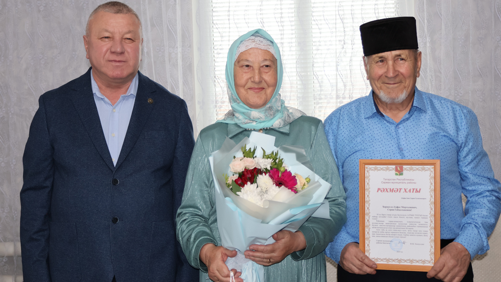 Сегодня 7 апреля 2025года в рамках празднования Года защитника Отечества и проекта «Крепкая семья» Глава Сармановского муниципального района Фарит Мунавирович Хуснуллин поздравил юбиляров Альфиса Миргалиевича и Сарию Габдулхаковну Салиховых с Золотой свадьбой. Свои добрые пожелания и поздравления юбилярам выразили заместитель руководителя Исполнительного комитета, председатель Совета женщин района Индира Раисовна Сахипова, начальник отдела ЗАГС Гульчачак Амирзяновна Валишина, председатель Совета ветеранов Асыляр Мунавирович Харисов, руководитель Исполнительного комитета Сармановского сельского поселения Лилия Ивановна Шарипова, родные и близкие.