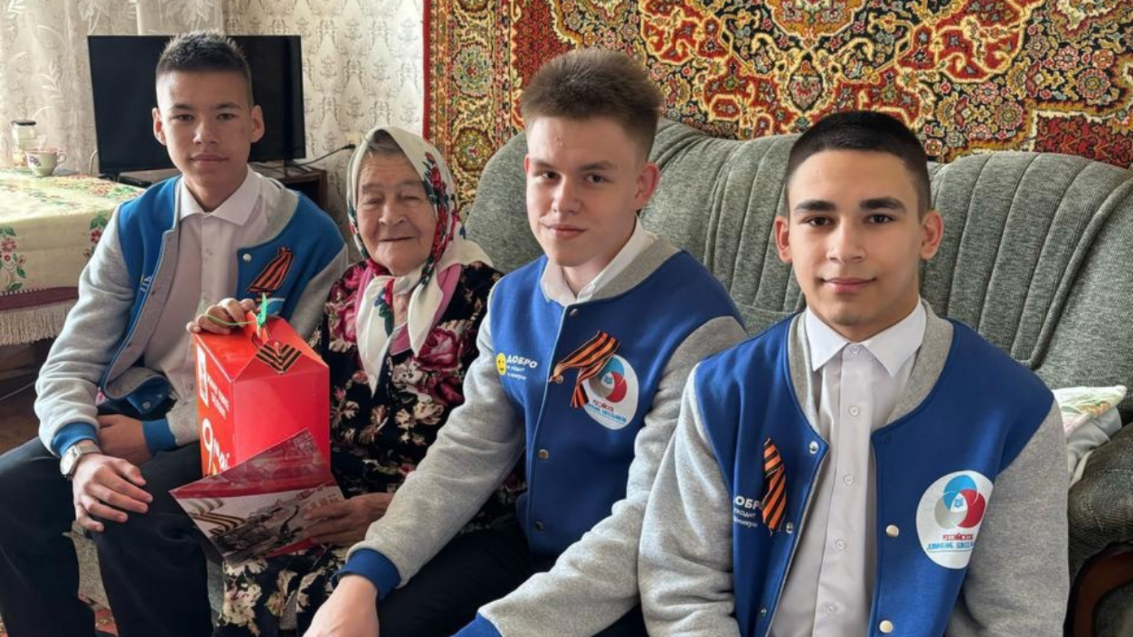 Волонтеры Победы Джалильской школы №1 вручают подарки людям, пережившим войну.