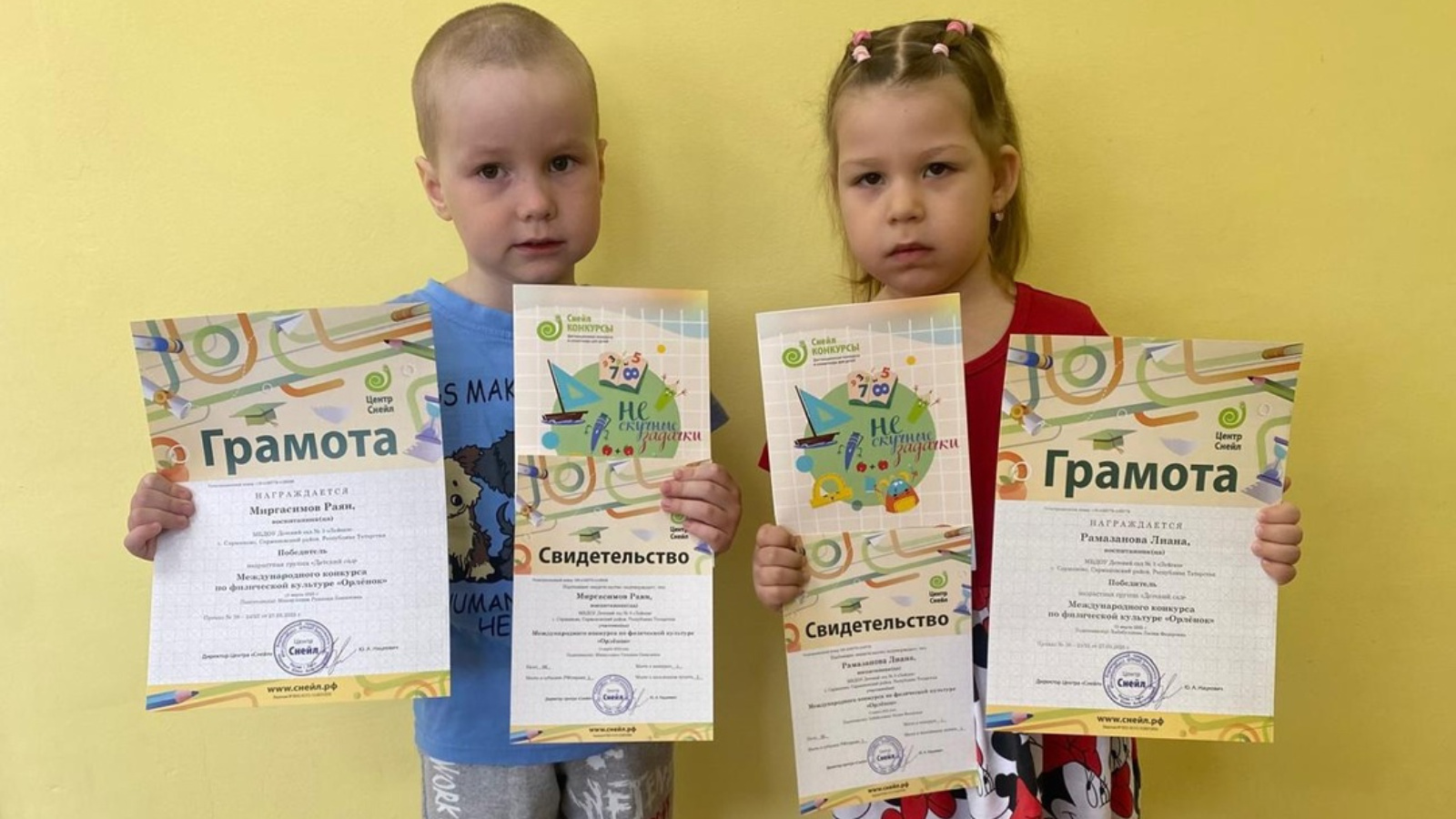 Воспитанники нашего детского сада приняли участие в международном дистанционном конкурсе по физкультуре «Орленок», организованный центром «Снейл» и стали победителями 9 воспитанников: Рамазанова Лиана,Миргасимов Раян, Бикмиева Азалия, Авзалов Самир, Мусина Дина, Урматов Дастан, Арефьев Саид, Хамитов Ралим, Шангараев Саид. Лауреаты конкурса: Бахтеева Ассель, Миннехузин Радмир, Салимгараева Гульфина, Шафигуллин Азамат. Поздравляем наших деток и желаем дальнейших успехов и побед. Не останавливаться на достигнутом, впереди много интересных и познавательных конкурсов.