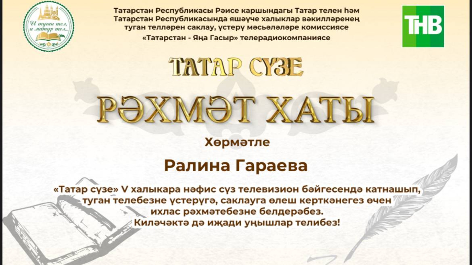 Участница конкурса «Татарское слово» 6-классница Гараева Ралина получила благодарственное письмо