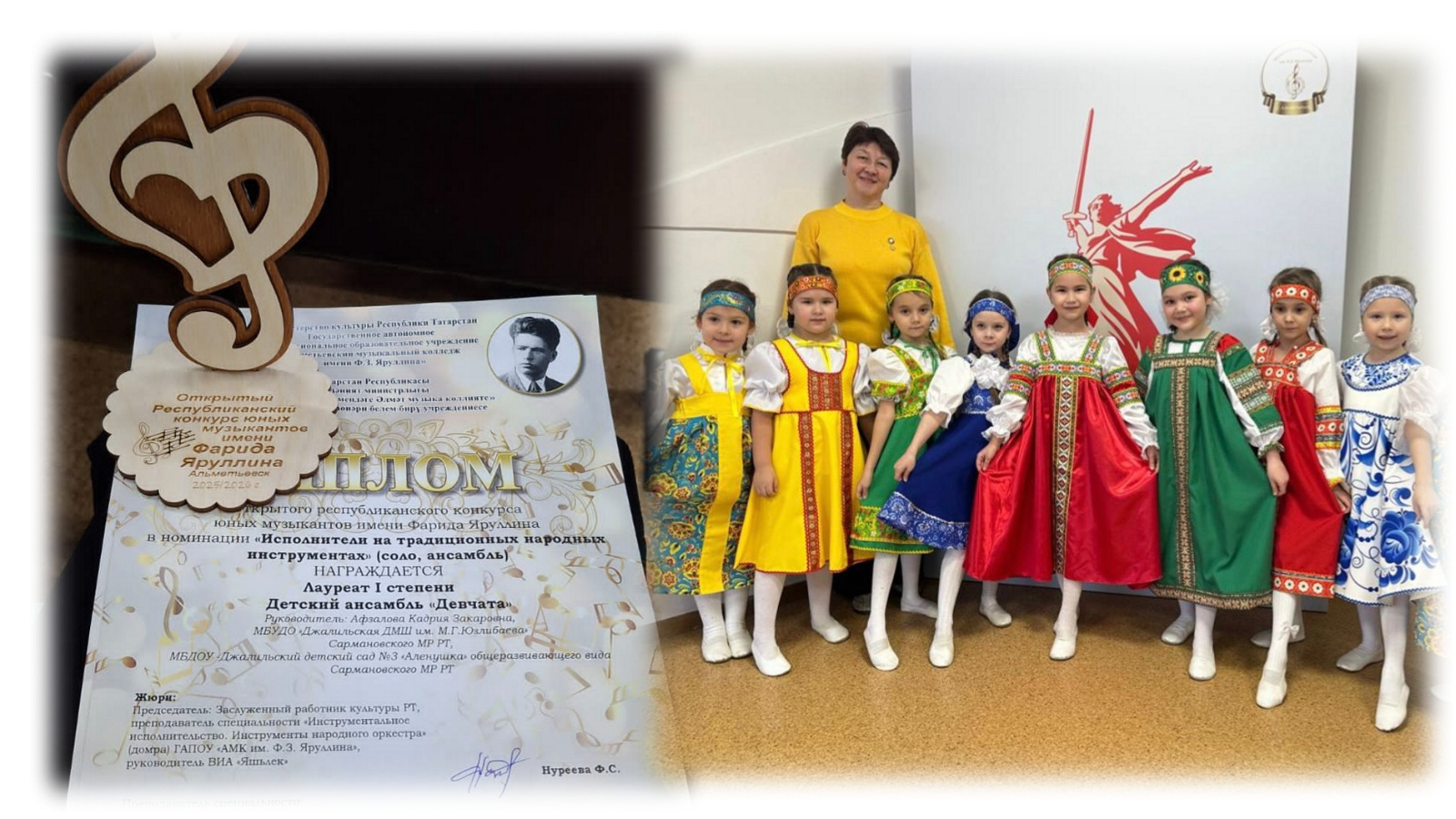 Ансамбль "Девчата" МБДОУ № 3 "Аленушка" под руководством Афзаловой К. З. стал лауреатом I степени на Открытом республиканском конкурсе юных музыкантов имени Фарида Яруллина. Поздравляем! Желаем дальнейших ярких побед!