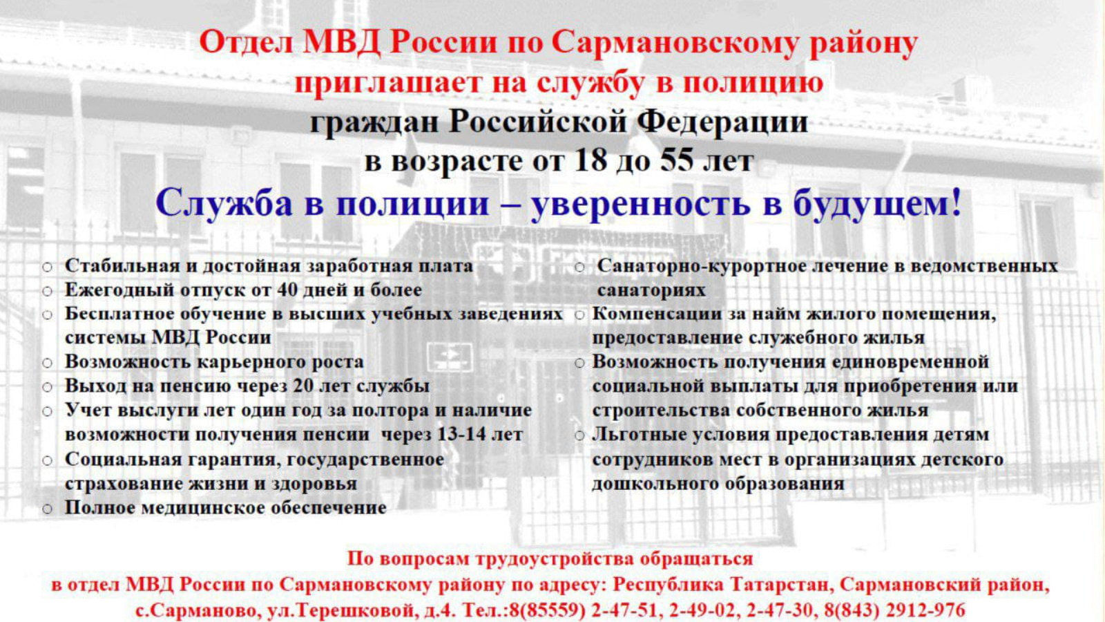 По вопросам трудоустройства обращаться в отдел МВД России по Сармановскому району по адресу: Республика Татарстан, Сармановский район, с.Сарманово, ул.Терешковой, д.4. Тел.:8(85559) 2-47-51, 2-49-02, 2-47-30, 8(843) 2912-976.