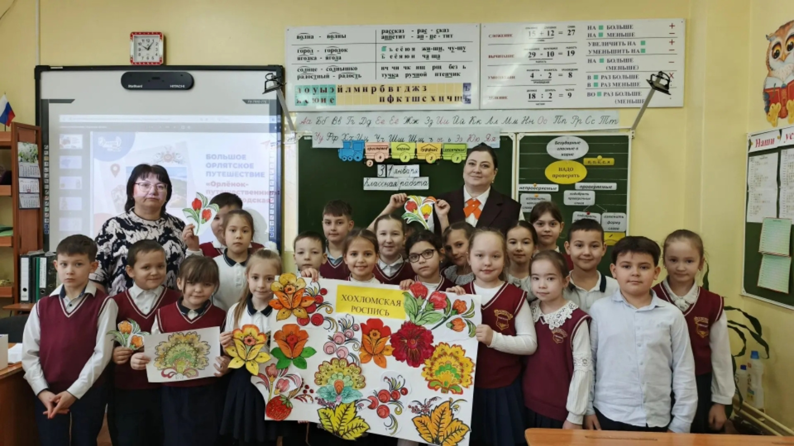 31 января 2026 года учащиеся 2Б класса МБОУ «Джалильская гимназия» отправились в большое путешествие по Нижегородской области. Тема занятия была волшебной и народной: «Золотая хохлома - душа Нижегородского края». Советник директора по воспитанию Граханцева Е. Р. совместно с учителем по ИЗО Гариповой М.М. пригласили юных «Орлят» в мир народных промыслов. Ребята познакомились с росписью и ее значением в культурном наследии. А главное — сами попробовали себя в роли мастеров. Каждый расписал свой узор, чтобы вместе создать яркую символическую скатерть-самобранку.