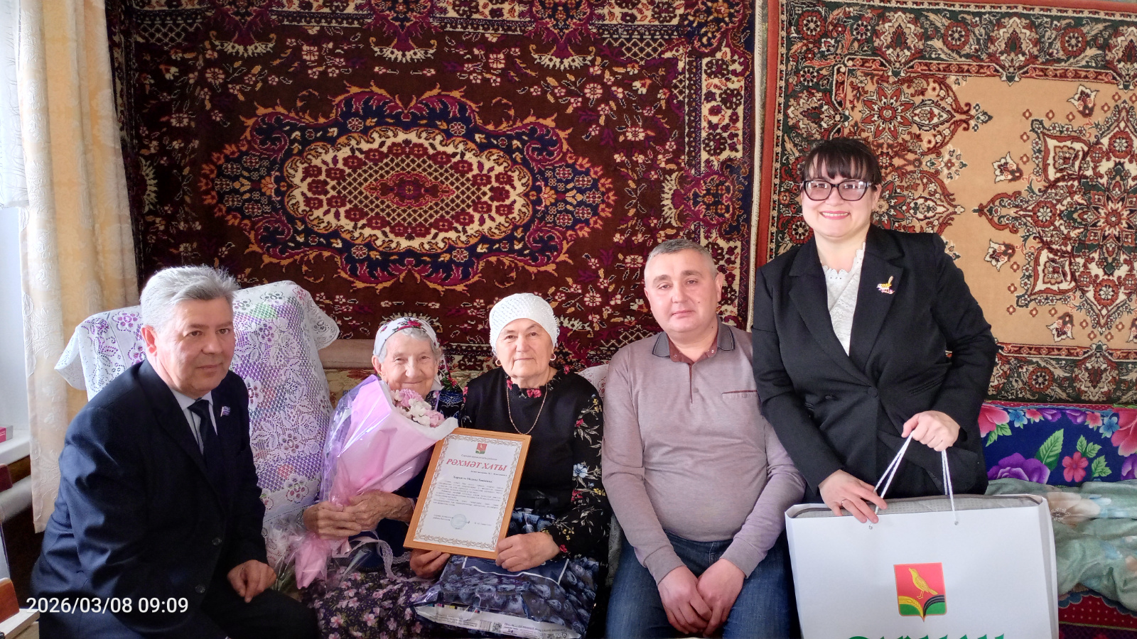 Сегодня отмечает свой 90-летний юбилей жительница села Большое Нуркеево Ахметшина Мадина Тазиевна. В этот знаменательный день от имени Главы Сармановского муниципального района Ф.М. Хуснуллина приехал поздравить Управляющий делами Исполнительного комитета Сафин Наиль Анварович, глава Большенуркеевского сельского поселения Сармановского муниципального района Сабитов Асхат Назхатович, секретарь Большенуркеевского сельского поселения Сармановского муниципального района Мухаметова Диляра Рафкатовна и Председатель Совета Ветеранов Хайбрахманова Муршида Назировна. Имениннице вручили благодарственное письмо и памятный подарок.