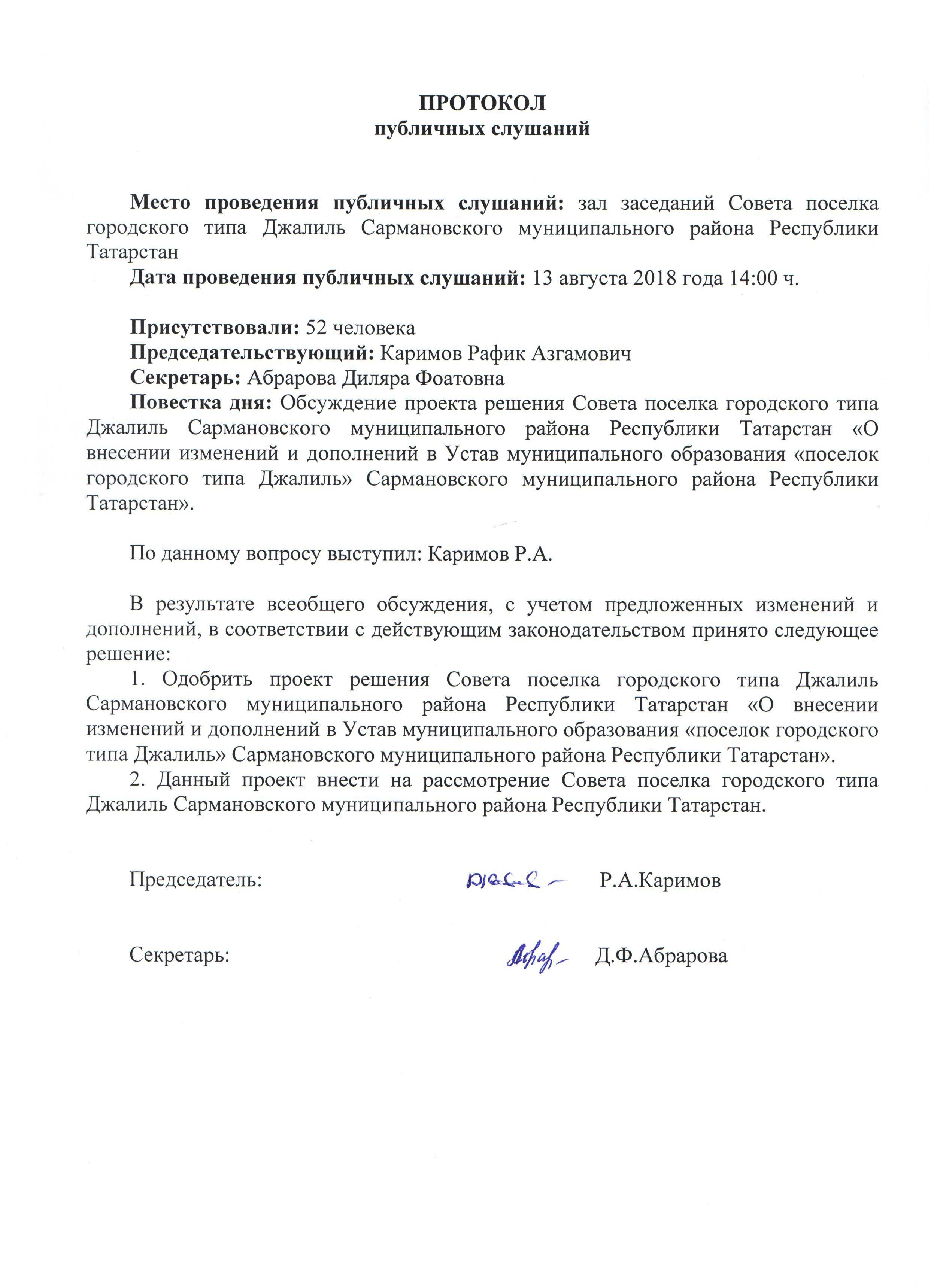 Протокол публичных слушаний по проекту "О внесении изменений и дополнений в Устав МО "п.г.т. Джалиль"