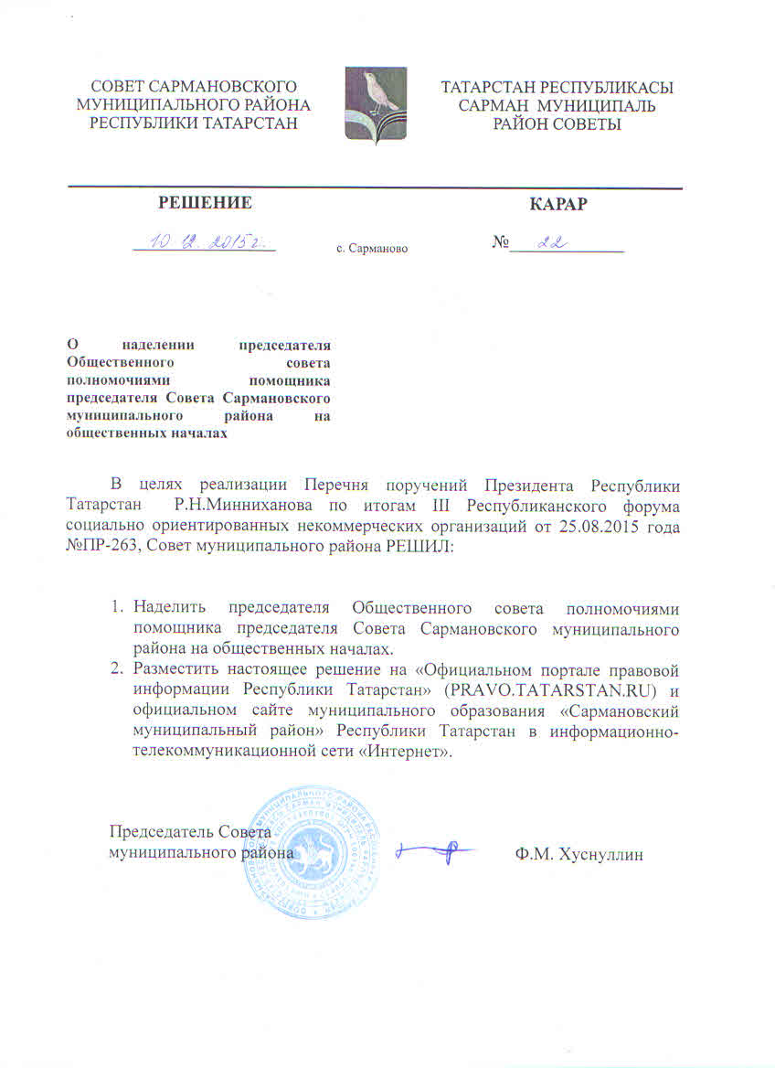 Решение Совета Сармановского муниципального района от 10.12.2015 г. № 22 "О наделении председателя Общественного совета полномочиями помощника председателя Совета Сармановского муниципального на общественных началах"