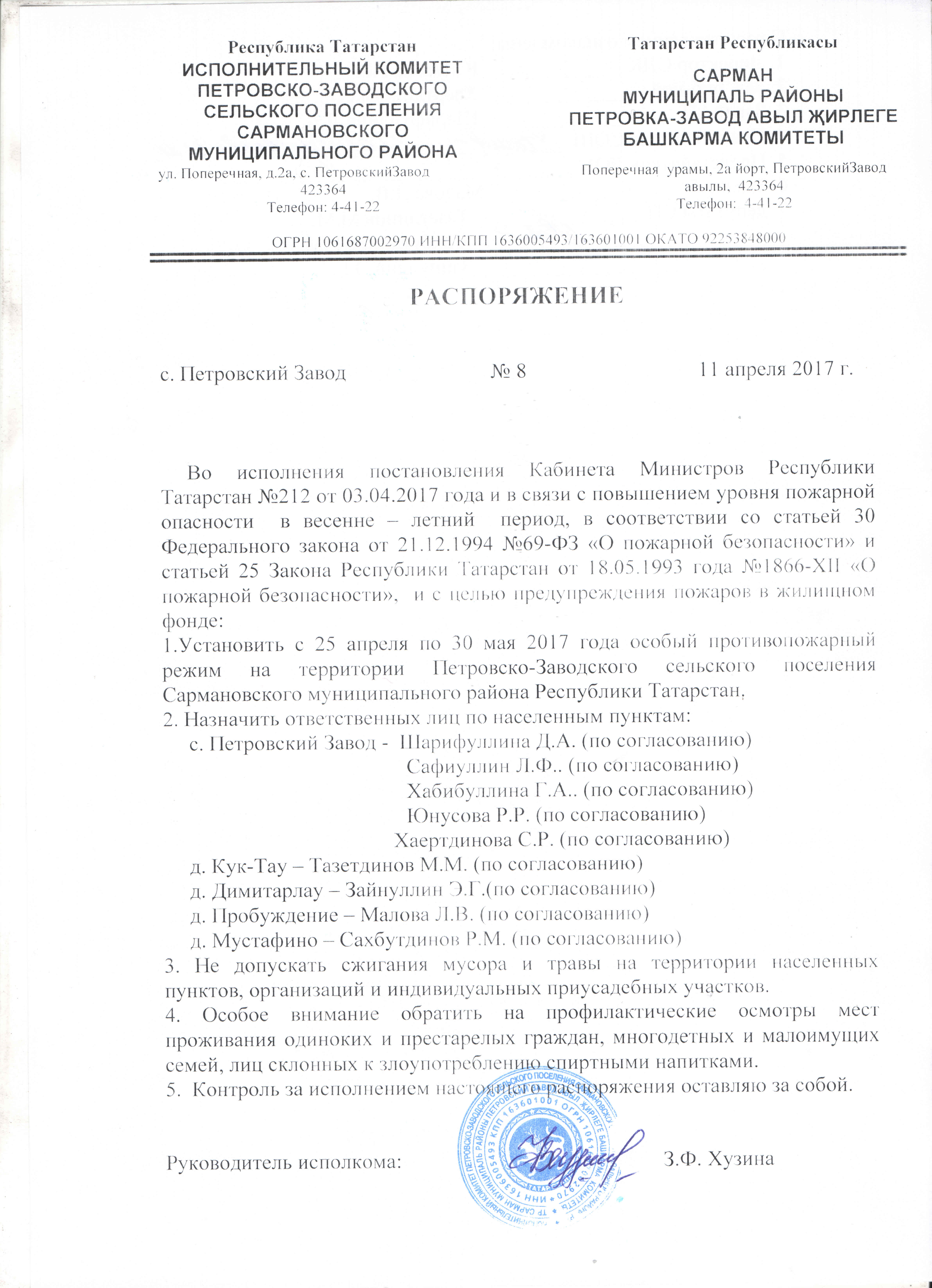 Распоряжение №8 от 11.04.2017 г. "Об установлении особого противопожарного режима"