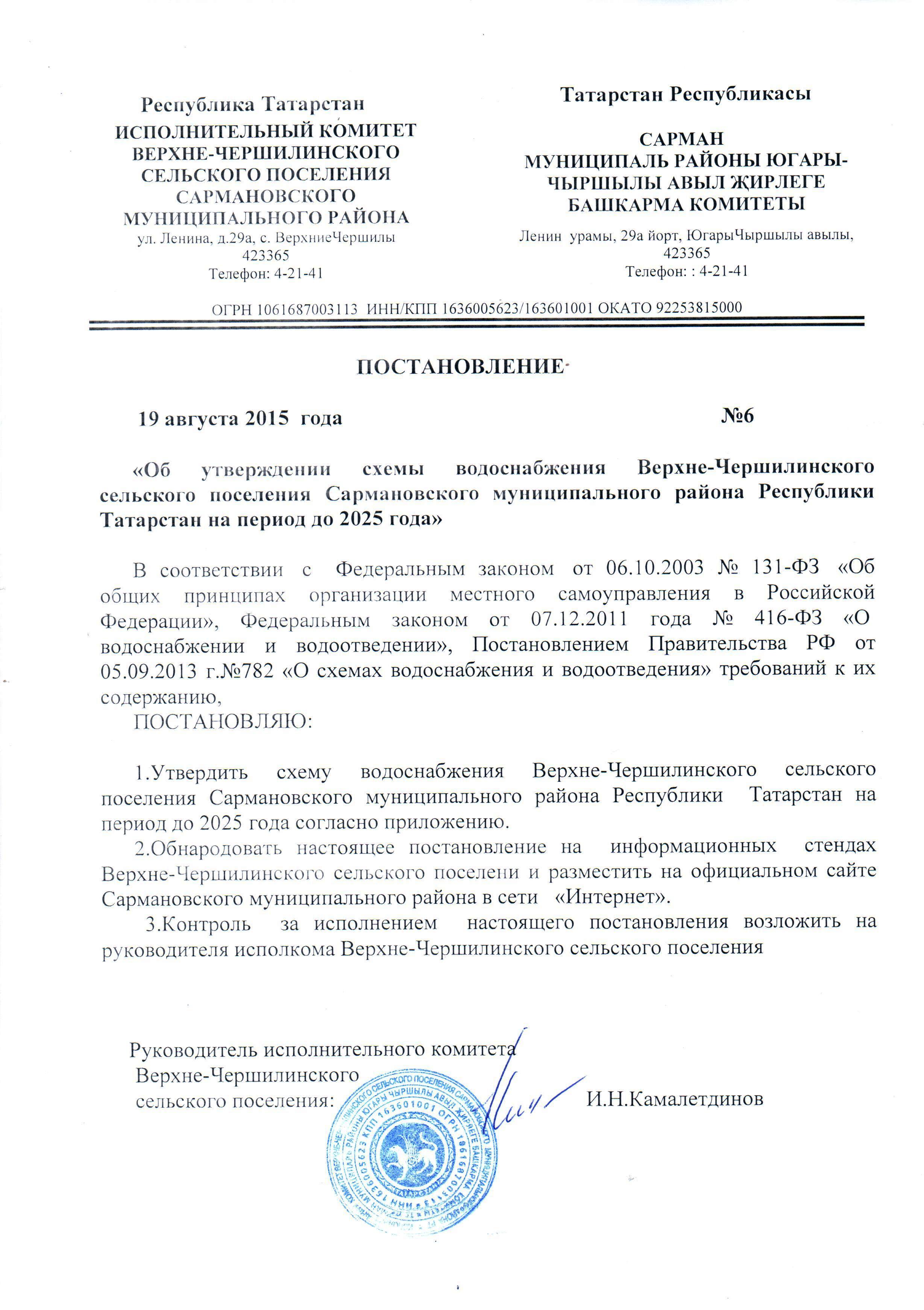 Постановление №6 от 19.08.2015"Об утверждении схемы водоснабжения и водоотведения Верхне-Чершилинского СП"