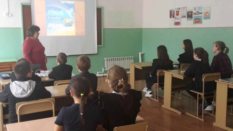 Башлангыч сыйныф җитәкчеләре " дан син, син минем Русь!». Укучыларга Халыклар бердәмлеге көне бәйрәменең килеп чыгу тарихы, халыкның батырлыгы турында сөйләделәр, батырлык һәм намус темасына әңгәмә үткәрделәр. 5-7 сыйныф укучылары белән " Ватан нәрсәдән башлана?». Чара барышында Халык бердәмлеге көне турында мәгълүмати — тарихи белешмә хакында фикер алыштылар. Тарих һәм җәмгыять белеме укытучысы Хәлиуллина Р. Х. 8-9 нчы сыйныф укучылары өчен «геройлар белән дан син, Россия!». Укучылар халык ополчениесе геройлары — Д.Пожарский һәм К. Минин турында мәгълүмат һәм презентацияләр әзерләделәр, «Смута»темасына фильм күрсәтелде. Мәктәп китапханәчесе Һадиева Л.Р. «китап – тарихны саклаучы»дип исемләнгән китап күргәзмәсе оештырды.