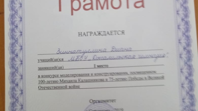 2019 нчы елның 7 нояберенда Сарманда Михаил Калашниковның йөз еллык юбилеена һәм Бөек Ватан сугышындагы жиңүнең 75 еллыгына багышланган муниципаль конкурс үткәрелде.5 Б сыйныф укучысы Зиннатулинна Диана "Поделки и моделирование" дигән номинациядә беренче урын алды. Без аны җиңүе белән котлыйбыз һэм аңа киләчәктә дә уңышлар телибез.